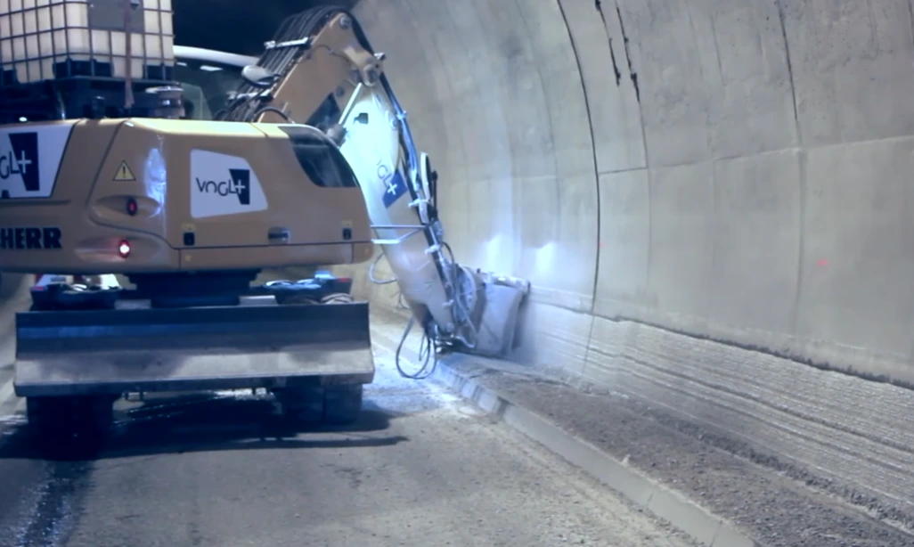 Après dynamitage, les fraises KEMROC lissent les irrégularités et réduisent la quantité de béton projeté requise.