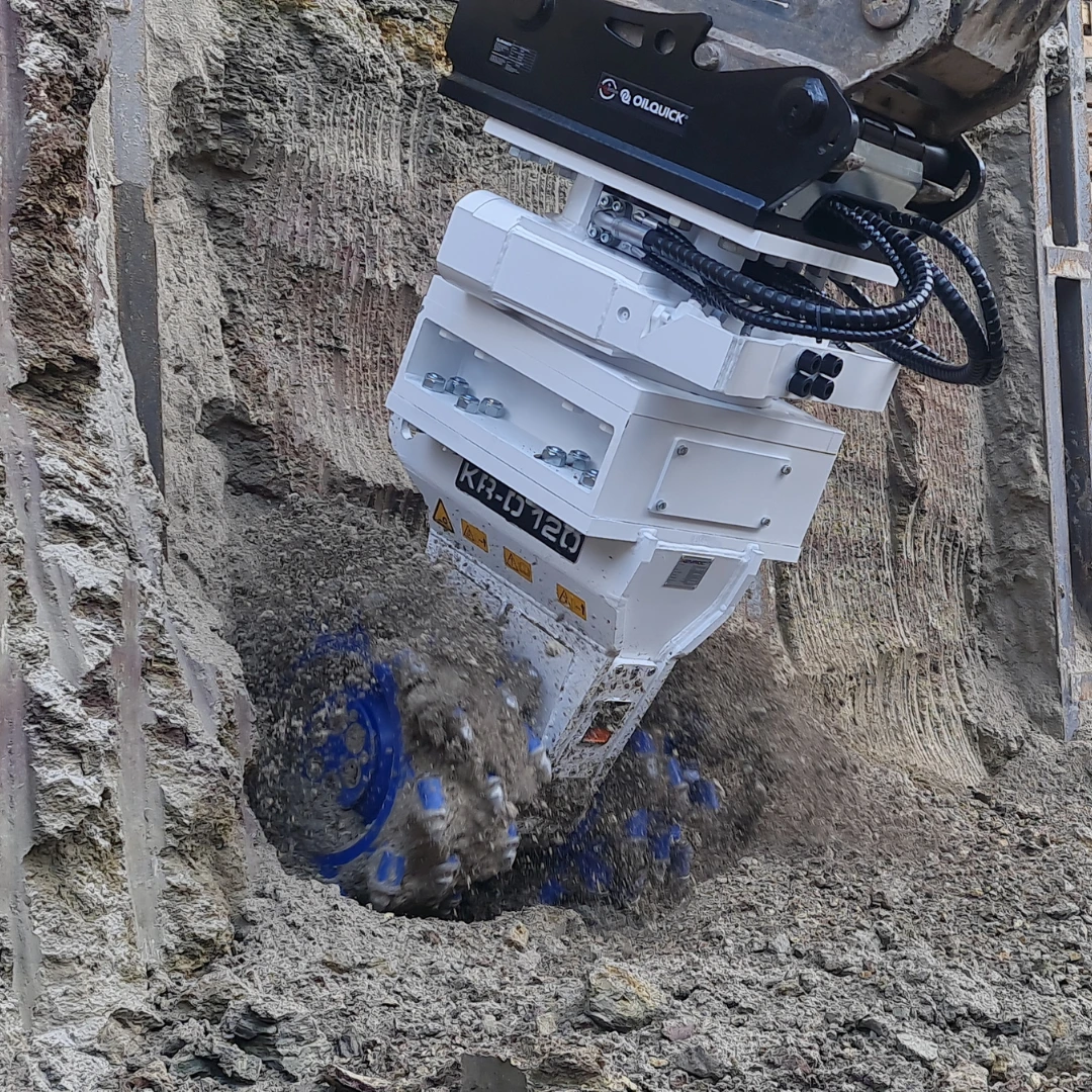 Les unités de rotation de la gamme KRM ont été développées pour être utilisées en combinaison avec les accessoires KEMROC. Grâce à ces unités de rotation, Les attachements de fraisage auront en permanence une position optimale tout en étant orientés dans la bonne direction pour effectuer un fraisage plus rapide, avec plus de précision en limitant au maximum les mouvements de la pelle. En combinaison avec les raboteuses de la gamme EX, le fraisage peut être effectué à la fois longitudinalement devant la pelle ou perpendiculaire ment à la pelle sans devoir la dépla cer. Vous pouvez même travailler à côté de la pelle. Equipés d’unités de rotation, les accessoires des gammes DMW, EK ou encore KTR peuvent également bénéficier de cette flexibili té de la position de coupe. Les fentes horizontales peuvent facilement être réalisées grâce à une scie de la gamme KDS équipée d’unité de rotation KRM. Selon l’application, les unités de rotation KRM peuvent augmenter la productivité jusqu’à 50 %, notamment dans le creusement de tranchéespro fondes d’assainissement, les travaux de reprofilage et le creusement de tunnels.